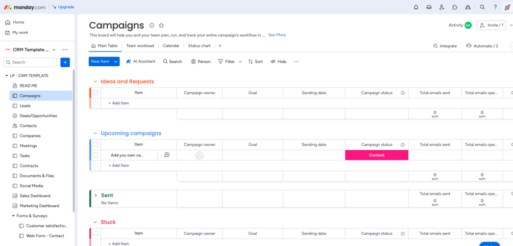 - Campaigns board to manage and schedule email campaigns (Works well when integrated with Mailchimp).